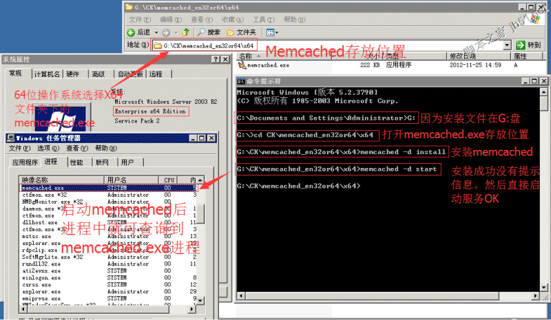 安装步骤不是很复杂。第一:找到文件(memcached.exe)路径。第二: memcached -d install 就OK..