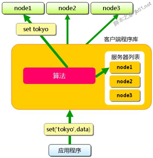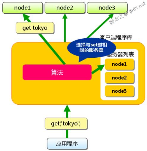 下面假设memcached服务器有node1~node3三台,应用程序要保存键名为“tokyo”、“kanagawa”、“chiba”、“saitama”、“gunma”的数据。
