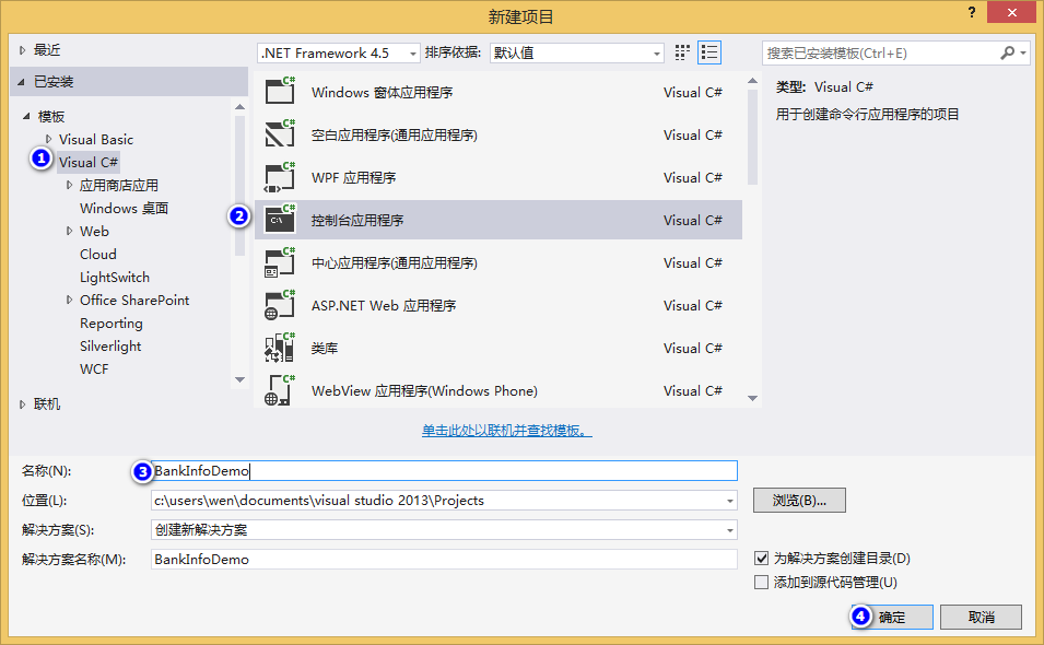 1.创建项目:BankInfoDemo(控制台应用程序)