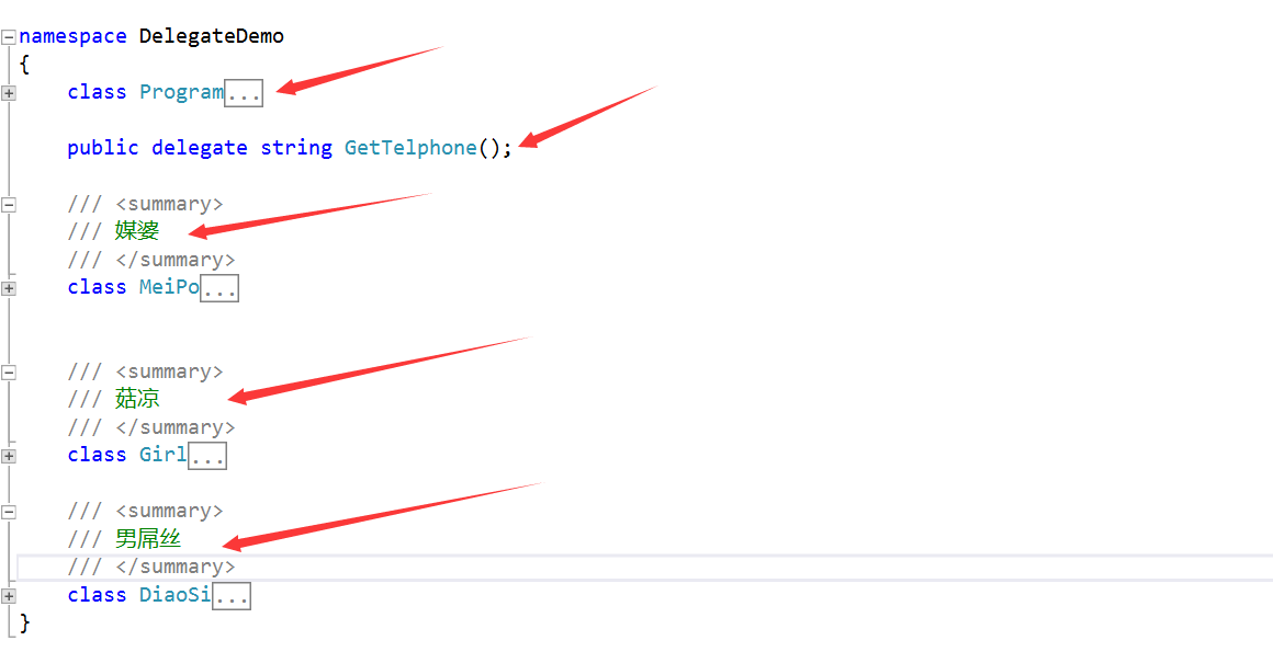 2、创建委托对象,委托是一个类,所以用new来实例化。委托即指方法的引用,所在初始化时传入指向的方法引用new Girl().GetGrilTel