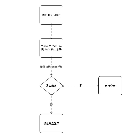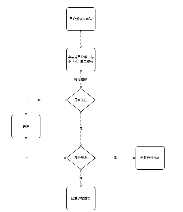 在通过微信接口申请临时的带参数二位码显示在pc网页上,所带参数是根据登录用户生成的唯一标识一串数字 ,当用户扫描的时候微信回复的参数即为这串数字,将这串数字和openid保存在数据库对应的用户表中即可。
