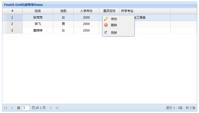 FineUI官方Demo上一直没有Grid右键菜单的实现,其实从4.1.x的版本开始,允许添加自定义的事件监听(Listeners),所以要实现这个功能已经相当容易了。