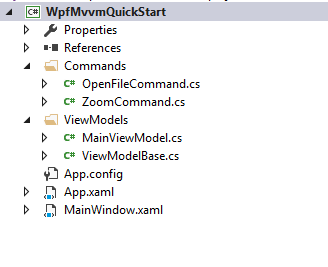 下面通过一个简单的例子,来介绍一些WPF MVVM模式。示例将展示一个图片浏览器,打开图片,放大/缩小图片大小。首先项目结构: