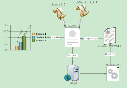 解决方案是使用第三方HighCharts组件DoNet.HighCharts, 该组件是一个服务器端生成HighCharts Js脚本的开源组件,然后通过输出流的方式插入到页面Body块的DIV中,原理如下图所示: