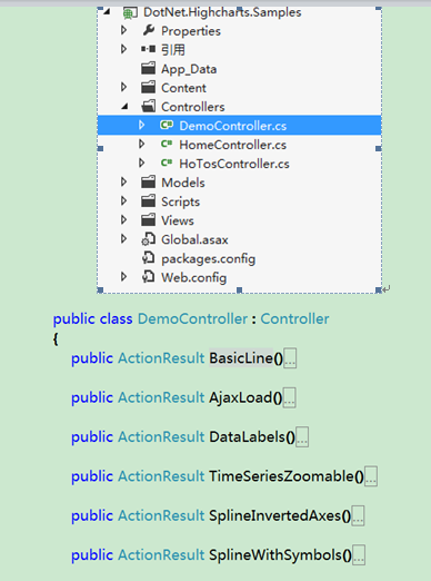 DoNet.HighCharts开源项目是以ASP.NET MVC3 Project的形式分发的,开发人员可以参考控制器文件夹Controlls中的DemoController中每种图表的后台代码(和前台HighCharts JS代码基本一致)