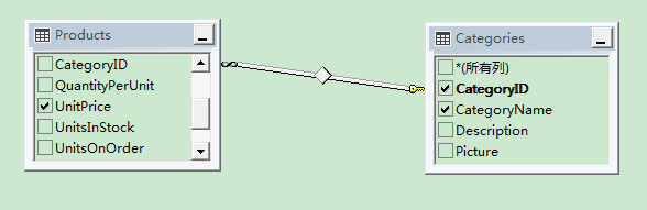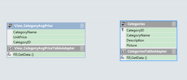 数据集分为强名称数据集和弱名称数据集(DataSet)两种,具体原理就不展开描述了。拖放View_CategoryAvgPrice和Categories表到数据集中。