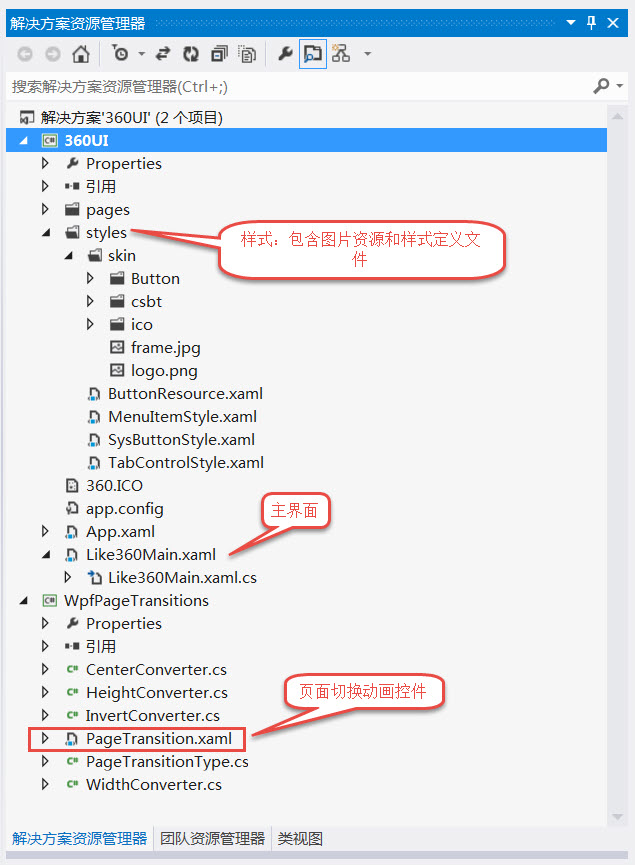 WpfPageTransitions是一个WPF类库,实现UI页面切换动画效果,支持多种动画,可以通过TransitionType属性进行设置,其原理是定义了多个切换动画类型的Storyboard,程序根据配置的TransitionType去执行匹配的Storyboard动画(分出入动画,xxxxxxIn和xxxxxxOut)。360UI是一个WPF 桌面应用程序,styles文件夹下存放了定义的按钮样式、菜单项样式、页签样式等样式和需要的所有UI切图资源。pages文件夹下存放切换的详细子页面。