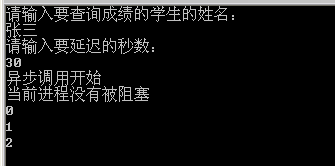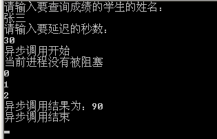 因为我们输入的还是30秒,所以我们要等到30秒后才能输出“异步调用结果为:90”这句话,这是谁也改变不了的,但是和同步调用不同之处在于,“当前进程没有被阻塞”和for循环立即就输出了,所以证明你在延迟30秒的时候,我继续执行我下面的代码,你延迟你的我不管,我不等你,等你到猴年马月了,我继续做我的事情
