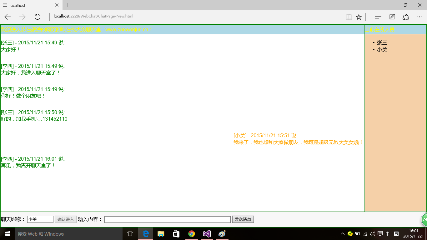 2。进入即离线均会自动生成通知信息显示在聊天室中,这样聊天的人们就知道谁进来了谁离开了;