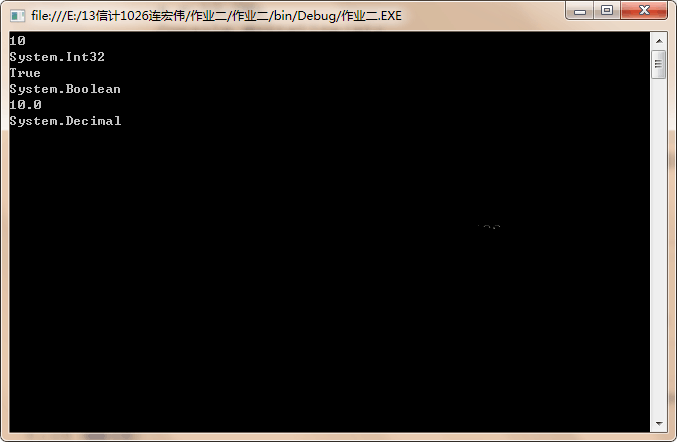 }分析:代码中的GetType()方法是获取变量的数据类型。第一次将整型值赋值给a,其次是布尔型,最后是decimal型。输出的结果为:从输出的结果可以体现出C#语言的类型强大功能