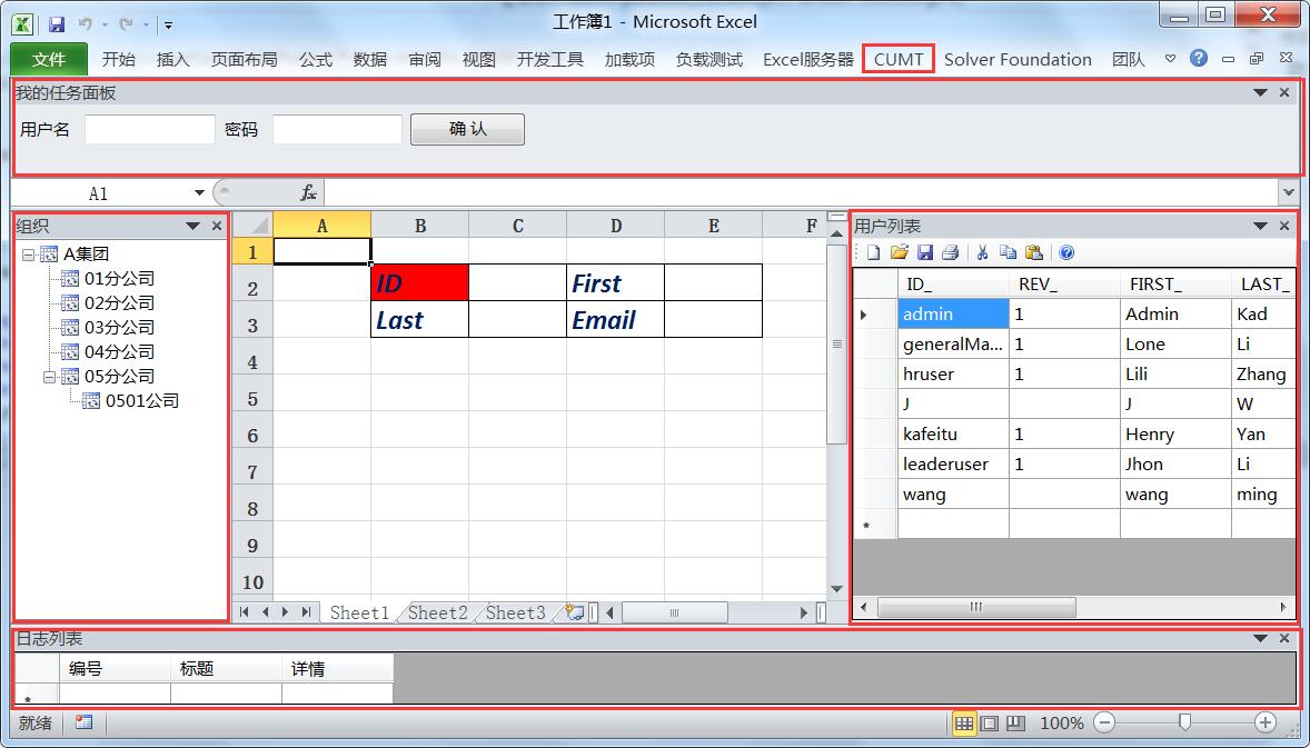 其中,RibbonAddIn可以定制2010的UI面板,SqlHelper.cs是一个简单的数据库访问帮助类,UClog.cs,UCPaneLeft.cs,UCTaskGrid.cs,UCTaskPane.cs都为添加的自定义控件,并通过程序添加到EXCEL界面中.运行起来的界面如下: