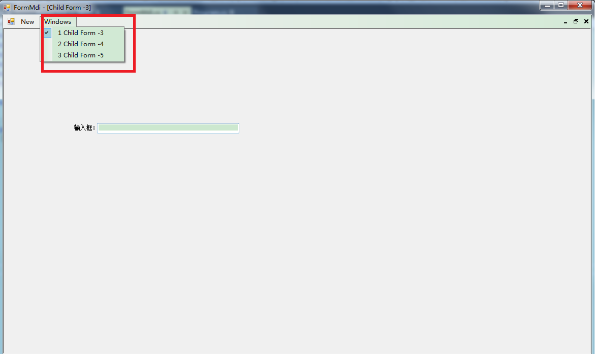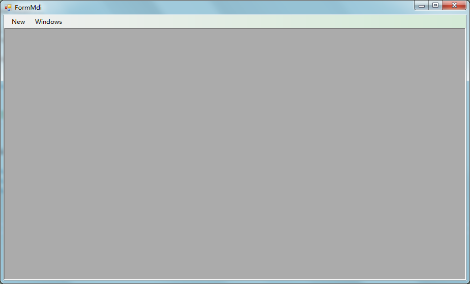 我这里因为只是演示,所以菜单控件上我只添加了两个菜单项,分别为:WINDOWS,用于显示WINDOWS已打开的子窗口列表,NEW,用于打开一个子窗口;SplitContainer控件全部采用默认的,没有放置任何控件在其中,如果用在正式系统中,一般左边Panel1中会放置一个树形菜单,右边Panel2中保持空即可,因为这个是用来作为子窗口的容器。