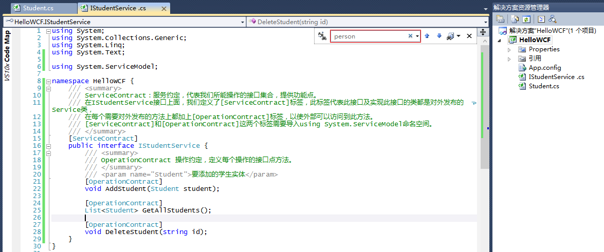 这两个类文件是两个WCF示例文件,对我们开发没有什么用处,现在我们删掉这两个文件。