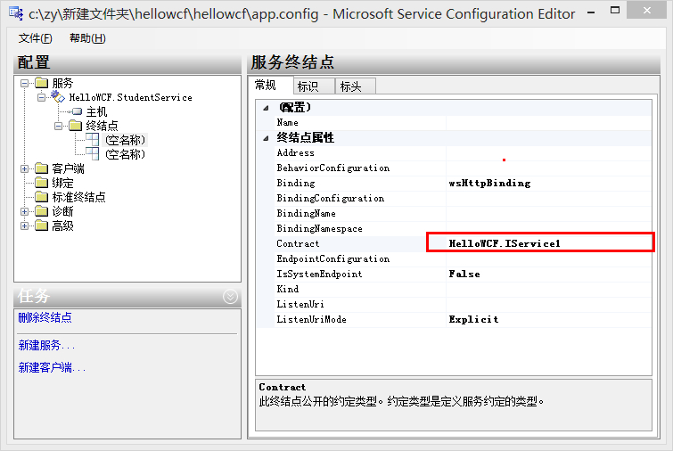 而另一个(即上面的终结点),是向外公布我们编写的[ServiceContract]的类,但我们可以看到它的Contract还是我们在第一步中删掉的HelloWCF.IService1这个终结点。