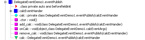 如上图所示,事件calc,经.net运行时编译为中间语言后产生了一个private 的calc属性,同时也自动生成了add_calc和remove_calc方法,用于注册和注销订阅者方法。因为事件是被封装的,尽管calc属性是private,但在所以在发布器类内部可以用 calc(sender,e)这样的方法直接调用;但在主程序中如果这样使用就会出错,只能通过onCalc方法进行间接调用。