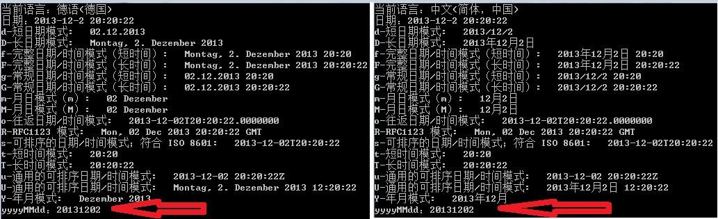 从结果可以知道,如果想通过CultureInfo来得到不同的语言格式,那么就不能用"yyyyMMdd","yyyy-MM-dd"等这种自定义格式。