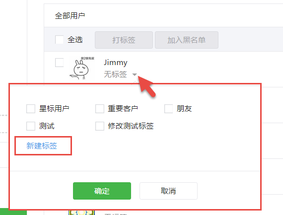 运营者可登录公众平台后台,点击左侧菜单“用户管理”后管理已关注用户,点击其中一个用户右侧的“标签”小角标可弹出复选框快速为该用户添加标签,且添加标签复选框内已支持直接新建标签。