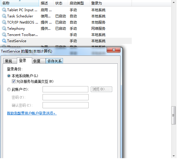 注册后,就看用“sc start” 或者“net start” 等命令来操纵服务了。在“服务”控制器里面控制与可以:如图