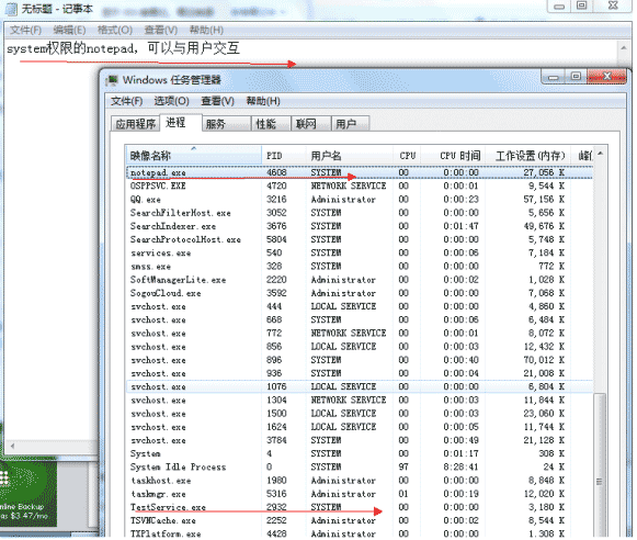 5、启动服务后显示了system权限的Notepad.exe,并且可以与用户进行交互