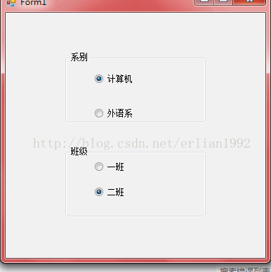 在窗体上添加两个GroupBox控件gpbSystem和gpbClass,设置gpbSystem控件的Text属性为系别,并放置两个RadioButton控件,分别设置它们的Text属性为“计算机”和“外语系”。同样设置gpbClass的Text属性为班级,并放置两个RadioButton控件,分别设置它们的Text属性为“一班”和“二班”。