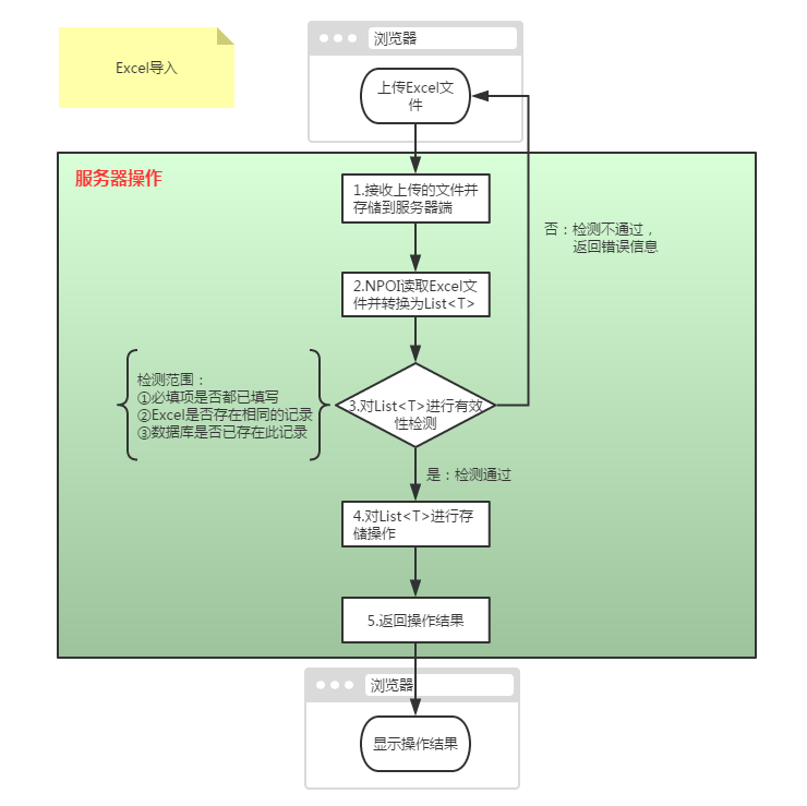 说明:对Excel转换后的List<T>进行后续操作;如:检测有效性、持久化存储等等