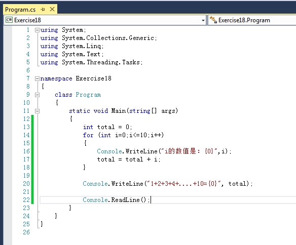 你创建一个项目。解决方案名称为Sloution18,项目名称为Exercise18,项目类型为控制台程序。点击Program.cs. 在里边加入这些代码。