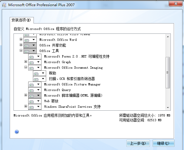 安装后控制面板-->卸载或更新程序-->选择Office2007-->选择更改-->选择添加或修复功能-->弹出下面界面,运行相应组件。