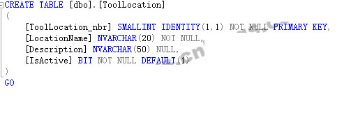 CREATE TABLE [dbo].[ToolLocation] ( [ToolLocation_nbr] SMALLINT IDENTITY(1,1) NOT NULL PRIMARY KEY, [LocationName] NVARCHAR(20) NOT NULL, [Description] NVARCHAR(50) NULL, [IsActive] BIT NOT NULL DEFAULT(1) ) GO Source Code