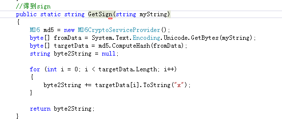 第二步,加密生成sign,一般是把加密特别抽出来作为一个方法,注意的是,需按照服务端指定的加密方式进行加密,至于是MD5还是其他加密,按规则来;例如: