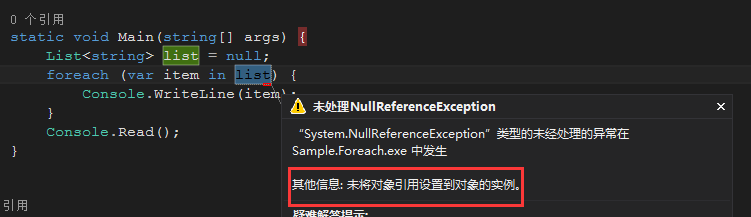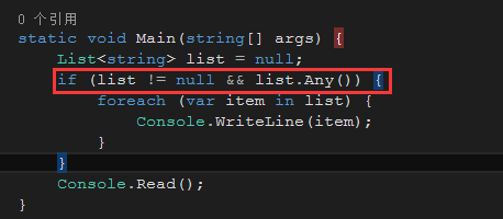 2、不知道微软封装foreach的为什么不先检查要遍历的对象是否为null,这样就导致,我们在写代码时,遍历列表时就要先判断列表是否为null,如下图: