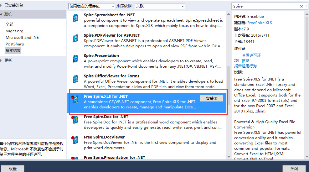 Spire.XLS也提供了Nuget的方式,只需要搜索Spire,选择免费版的组件即可:
