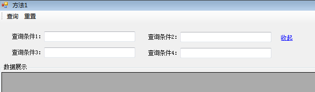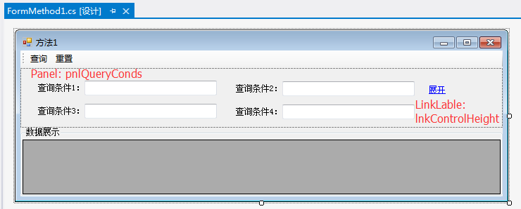 最开始我的实现方式是这样的,在界面上放置一个LinkLabel,设置此LinkLabel的鼠标单击事件,调整查询条件所在Panel的Height属性。