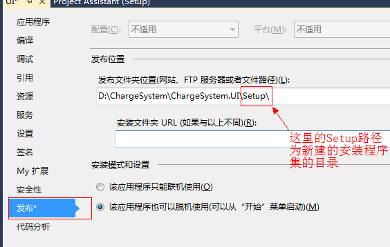 在继续往下操作前一定要选择发布,在启动项目的属性内设置发布文件夹默认路径设置为安装系统的文件夹。