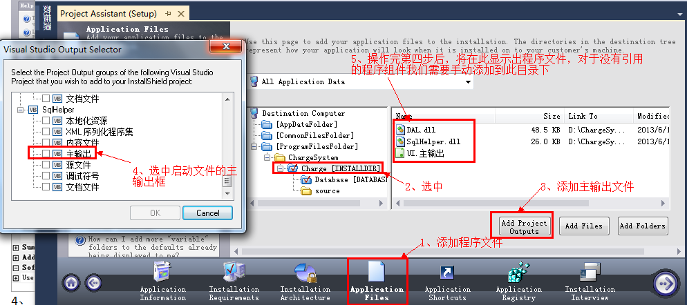在下图中的第四步中添加程序文件时会有主输出、源文件等多个选项框,其实它的生成机制和.NET程序的编译机制是相同的。下图中的第五部显示出的UI.主输出,在生成安装文件后程序包中包含了与UI层进行交互引用的其它层的引用文件,但不会生成和UI层(启动层)没有相连的组件,我们只能通过手动添加。