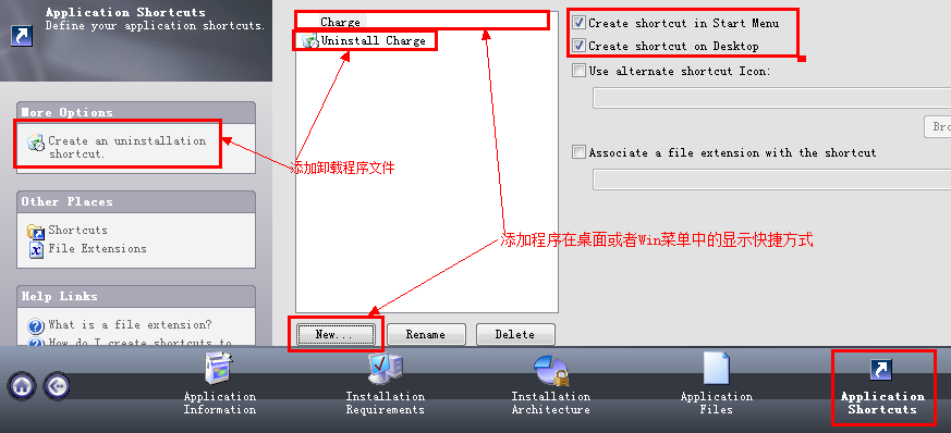 Application Shortcuts 程序快捷打开方式,Install为用户提供了两种显示形式,分别是Win菜单和桌面。下图显示了设置的一些注意项,此阶段也可以设置程序的显示图标。