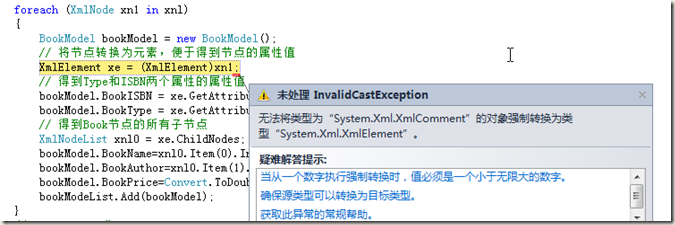 在正常情况下,上面的代码好像没有什么问题,但是对于读取上面的XML文件,则会出错,原因就是因为我上面的XML文件里面有注释,大家可以参看Book.xml文件中的第三行,我随便加的一句注释.注释也是一种结点类型,在没有特别说明的情况下,会默认它也是一个结点(Node).所以在把结点转换成元素的时候就会报错."无法将类型为“System.Xml.XmlComment”的对象强制转换为类型“System.Xml.XmlElement”。"