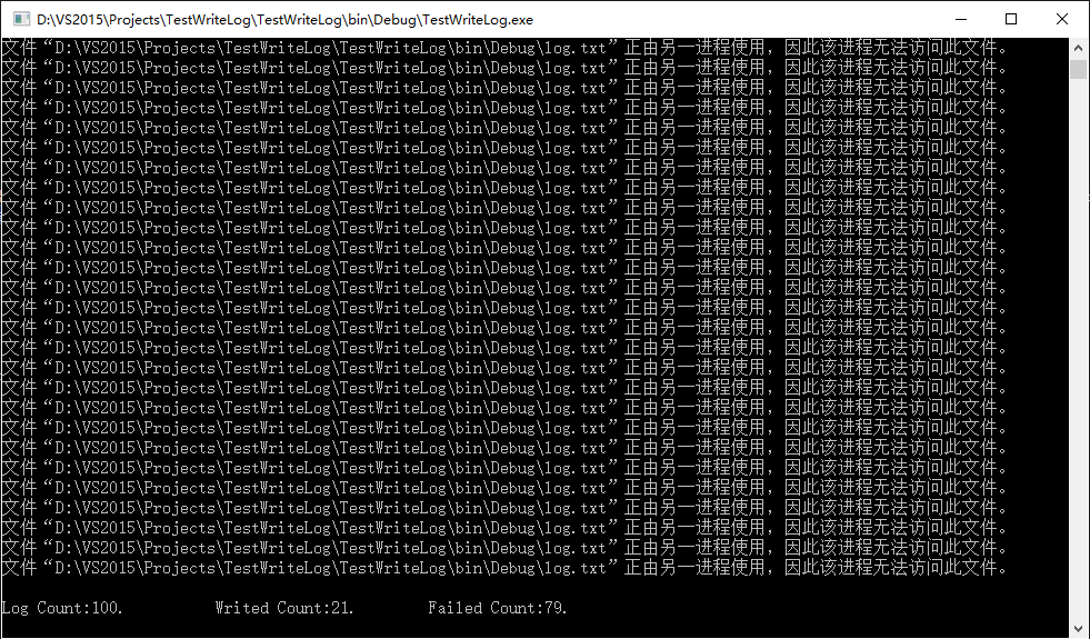 选择最后一种方法实现的时候,若对文件操作与线程同步不熟悉,问题就有可能出现了,因为同一个文件并不允许多个线程同时写入,否则会提示“文件正在由另一进程使用,因此该进程无法访问此文件”。