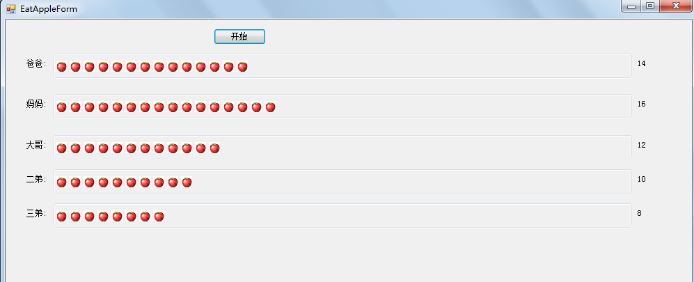 下面用一个模拟吃苹果的实例,说明C#中多线程的实现方法。要求开发一个程序实现如下情况:一个家庭有三个孩子,爸爸妈妈不断削苹果往盘子里面放,老大、老二、老三不断从盘子里面取苹果吃。盘子的大小有限,最多只能放5个苹果,并且爸妈不能同时往盘子里面放苹果,妈妈具有优先权。三个孩子取苹果时,盘子不能为空,三人不能同时取,老三优先权最高,老大最低。老大吃的最快,取的频率最高,老二次之。