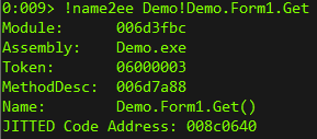 这里的地址(0x008c0640)可以通过MethodInfo.MethodHandle.GetFunctionPointer().ToPointer()方法获取