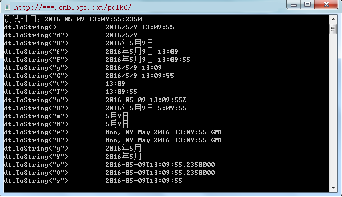 | y | DateTime.Now.ToString() | 2016/5/9 13:09:55 | 短日期 长时间 |