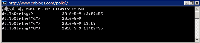 | G | DateTime.Now.ToString("G") | 2016/5/9 13:09:55 | 短日期 长时间 |