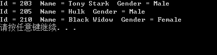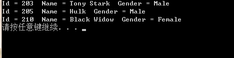 Console.WriteLine("Id = "+student.Id+" "+" Name = " +student.Name+" "+" Gender = "+student.Gender);
