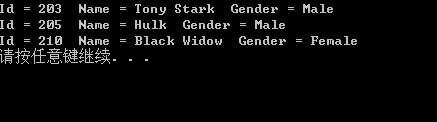 Console.WriteLine("Id = "+student.Id+" "+" Name = "+student.Name+" "+" Gender = "+student.Gender);