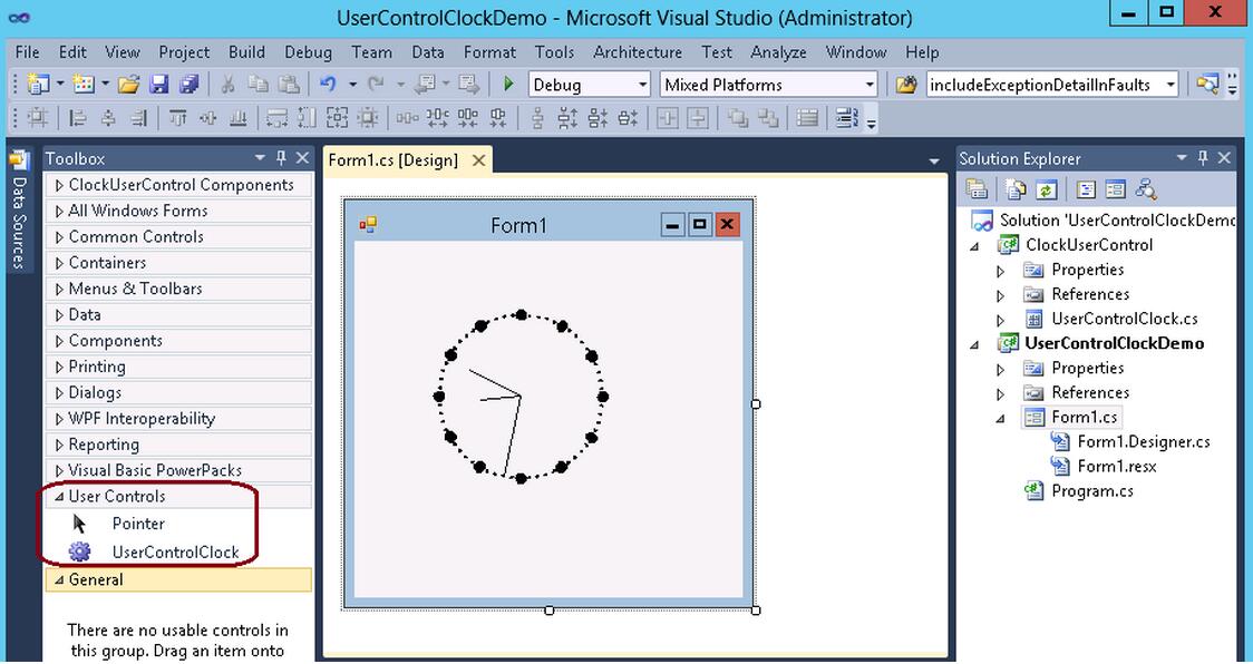 创建WinForm应用程序,在Toolbox添加Tab "User Control",再往其中拖入第4步中生成的自定义控件的dll文件。再把Toolbox中的用户控件“UserControlClock”拖到界面“Form1”中,如下图所示。