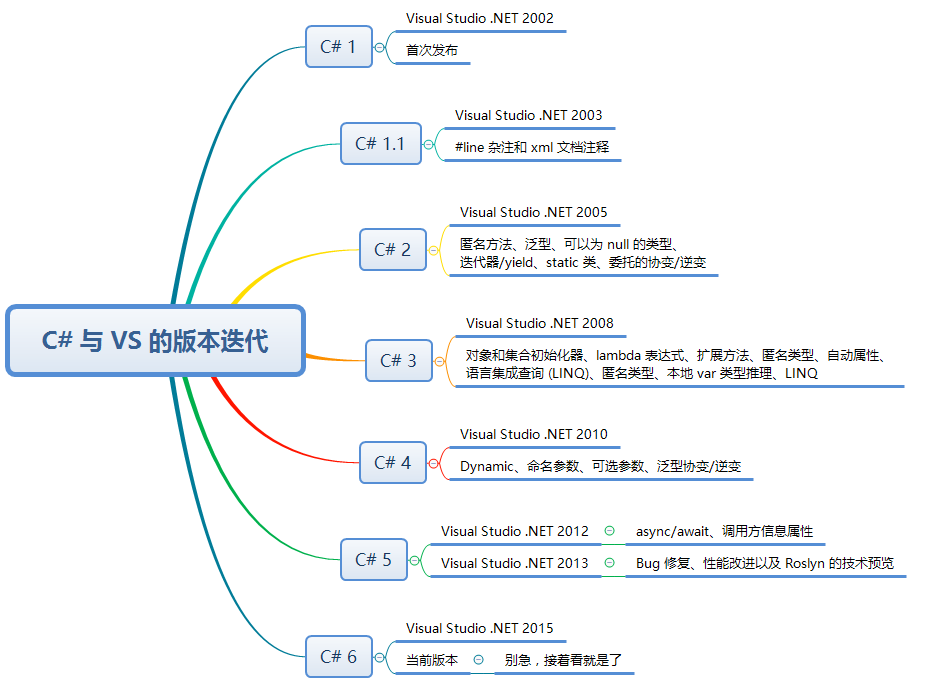 好了,废话不多说,我们先来回顾一下 C# 的版本史。后续我会对带 0 的版本号进行的简写:C# 6.0 -> C# 6。由于新的特性较多,笔者就每种特性只截取其中一部分作为示例,点到即止。