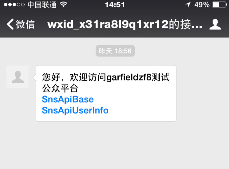 string content = "您好,欢迎访问garfieldzf8测试公众平台";