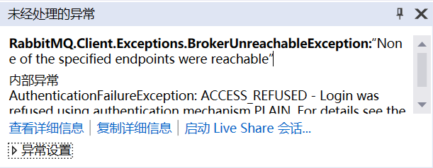 重新运行代码,会发现在运行到factory.CreateConnection()的时候,系统提示一个异常【RabbitMQ.Client.Exceptions.BrokerUnreachableException:“None of the specified endpoints were reachable”】,如下图: