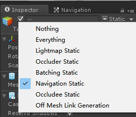 2.选择除了主角、目标以及摄像机、直线光以外的所有物体,在Inspector窗口的右上角勾选Static,成为静态物体,并设置成Navigation Static静态类型。