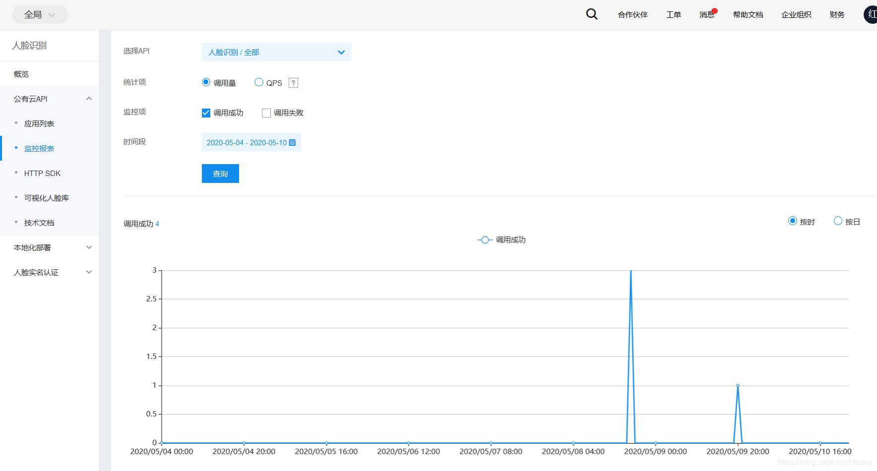 写到这我们就结束了,人脸识别的注册和搜索功能就已经都实现完毕了,接下来我们还可以在百度智能云的监控报报表中查看调用次数