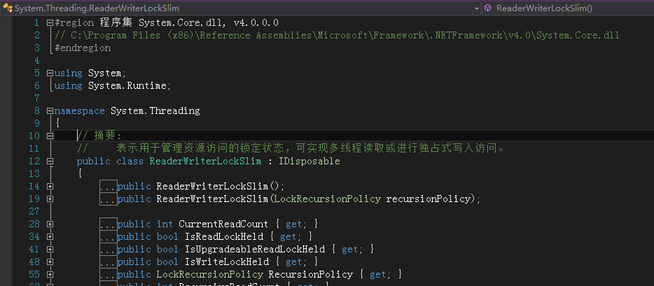如下图所示,在读取前,执行EnterReadLock()进入读取锁定模式,读完后,执行ExitReadLock()退出读取模式。如果是要写入,则执行该锁定对象的EnterWriteLock()、ExitWriteLock()方法。这样实现锁定对象与字典的对应。